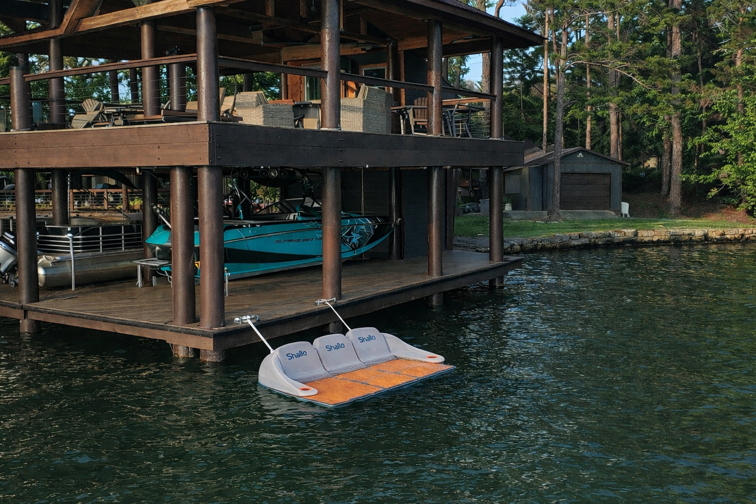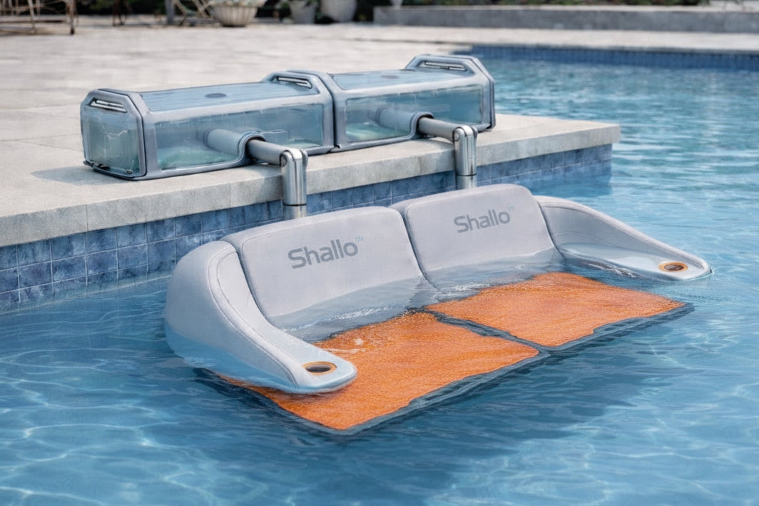 Shallo™Dock is the World's Only Depth-Adjustable, Walkable Water Platform. Sit, Stand, Play, Relax - IN the water, not floating on top of it.